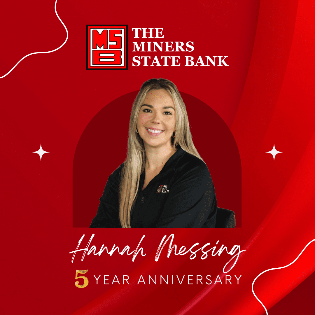Today we are very proud to be celebrating Hannah Messing and her 5 years with The Miners State Bank. We are grateful for your knowledge and dedication and look forward to many years to come. Thank you and congratulations! 🤩
