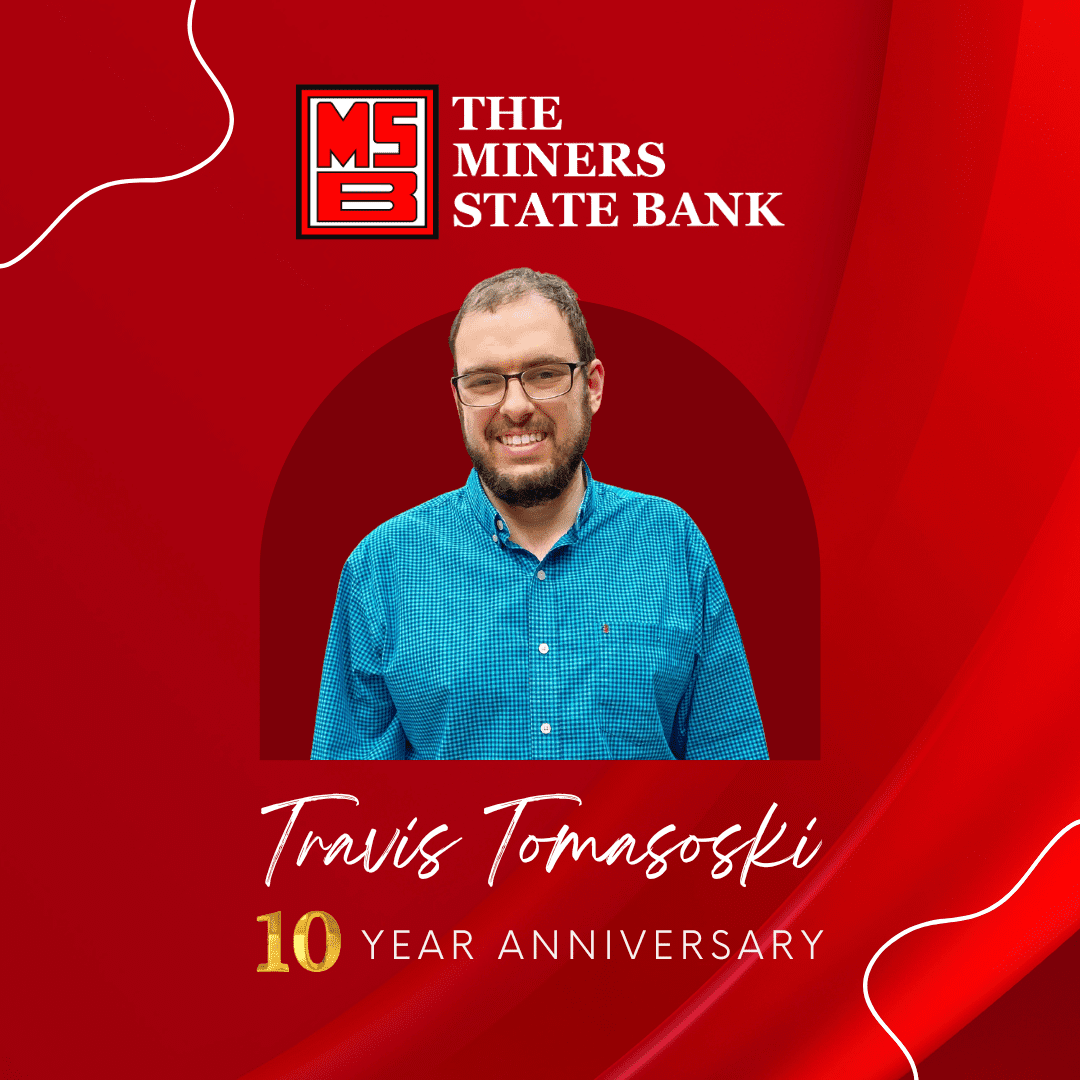 Today, we celebrate Travis’s ten years with The Miners State Bank! We are grateful for his dedication, commitment, and positive attitude every day. Thank you and congratulations, Travis!